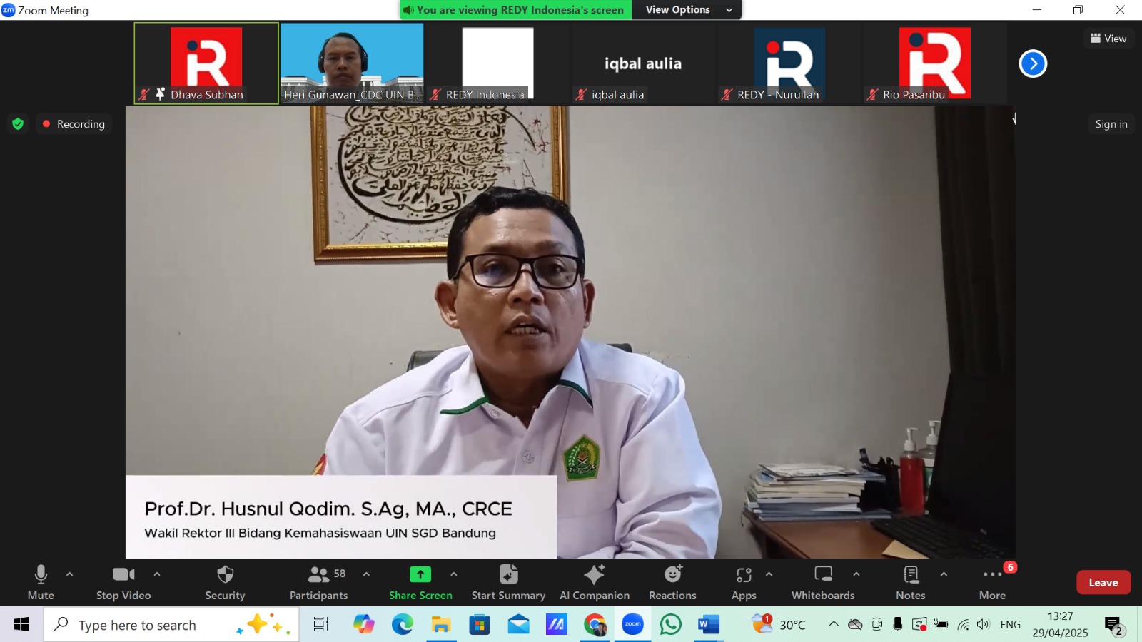 Guru Besar Fakultas Ushuluddin ini menyampaikan apresiasi kepada REDY Indonesia dan CDC UIN SGD Bandung atas terselenggaranya kegiatan ini, serta berharap kolaborasi dapat terus berlanjut untuk memberi manfaat lebih luas.