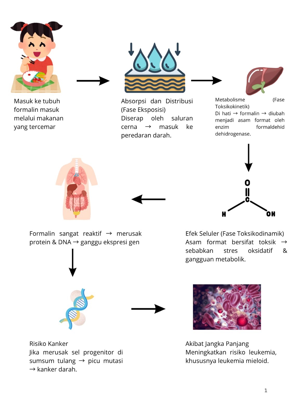 Formalin dikenal sebagai zat genotoksik, teratogenik, dan bersifat karsinogenik. Konsumsi berulang formalin dalam makanan telah dikaitkan dengan berbagai jenis kanker, seperti kanker saluran pernapasan atas, kulit, paru-paru, dan leukemia (Sun, 2025).
