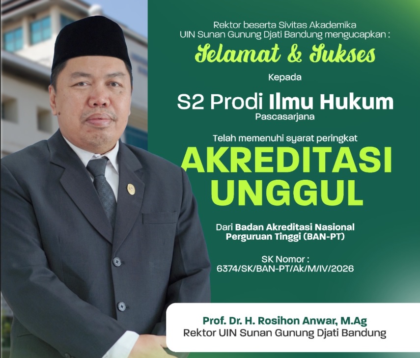 “Alhamdulillah, dengan penuh rasa syukur kepada Allah SWT, Program Studi Magister Ilmu Hukum Pascasarjana UIN Sunan Gunung Djati Bandung resmi meraih predikat Akreditasi Unggul dari BAN-PT,” ungkapnya.