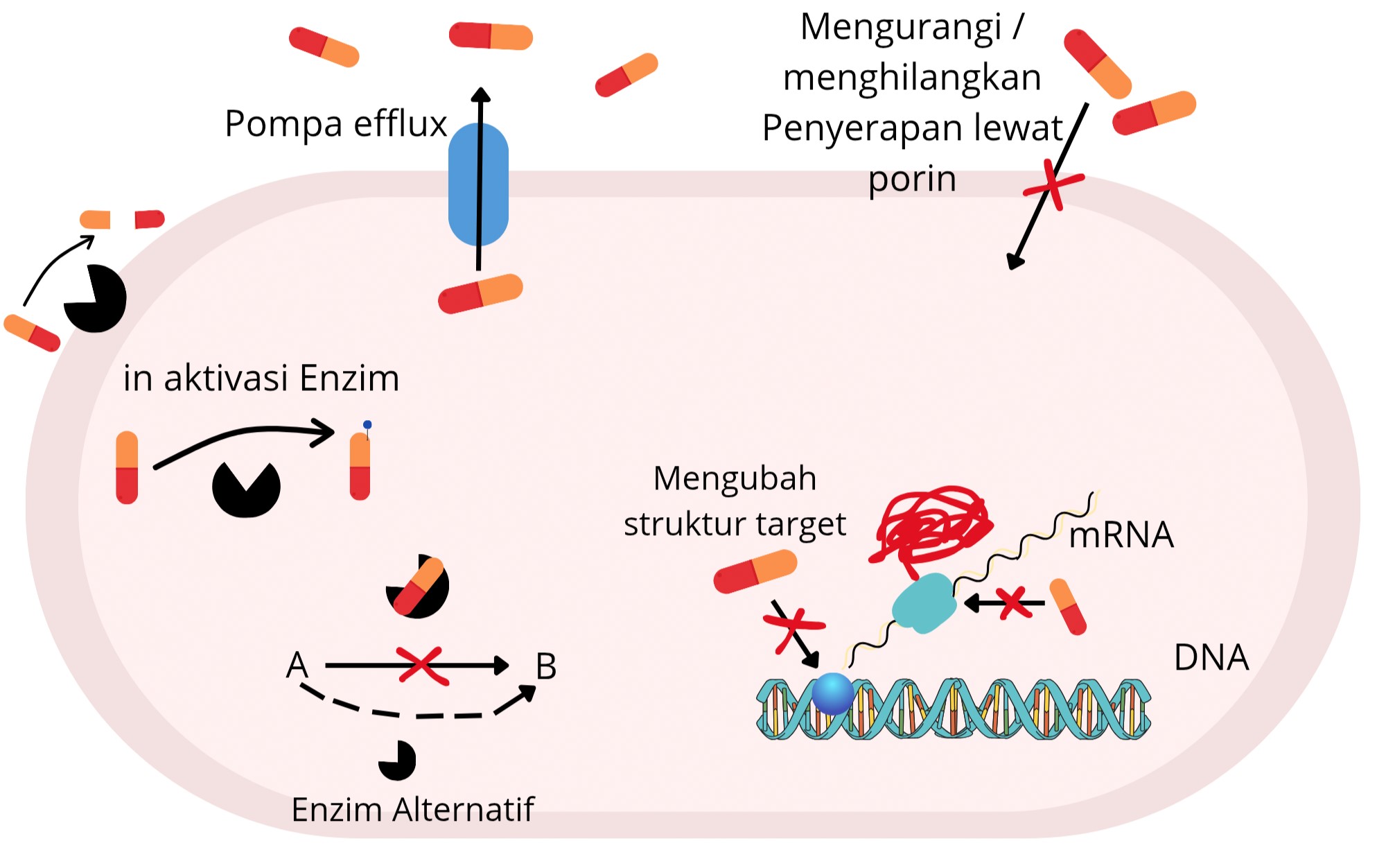 Mekanisme resistensi ini meliputi mutasi genetik, transfer gen resistensi antar bakteri, dan pengeluaran antibiotik dari sel bakteri.